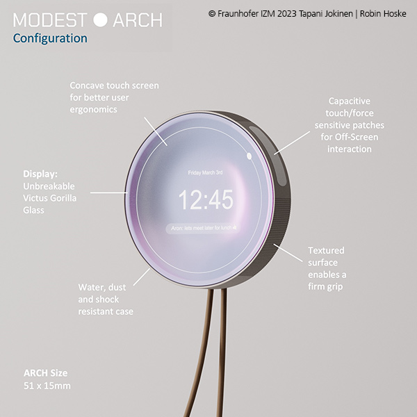 Das MODEST ARCH ist extrem kompakt in seiner Größe und zugleich mit neuen bemerkenswerten Funktionen ausgestattet. Aufgrund eines cloudbasierten Betriebssystems besteht das „nackte“ Telefon nur aus einem Webbrowser und es sind nur sehr wenige Bauteile, elektronische Komponenten und Materialien notwendig. Dennoch ist es möglich, das Smartphone mit zusätzlichen Funktionen zu erweitern und bedarfsorientiert zu konfigurieren. Die Grundidee dahinter ist, dass sich Nutzer*innen je nach ihren Bedürfnissen mit dem Gerät als geräteübergreifende Schnittstelle mit einer 5G-cloudbasierten Umgebung verbinden. Als Schnittstelle zu verschiedenen Geräten eröffnet das MODEST ARCH Chancen sowohl für skalierbare Anwendungslösungen als auch für neue digitale Geschäftsmodelle.