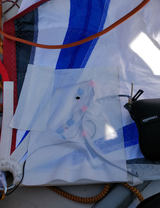 This also needed physical effort. The main module had to be soldered directly to the conductor laid within the sail channels. To do this, I laid down directly on the sail prepared in our hall, with soldering iron in hand: A work situation you don’t find yourself in that often.