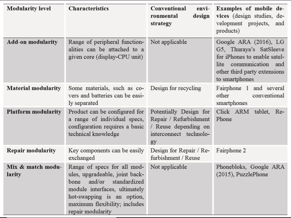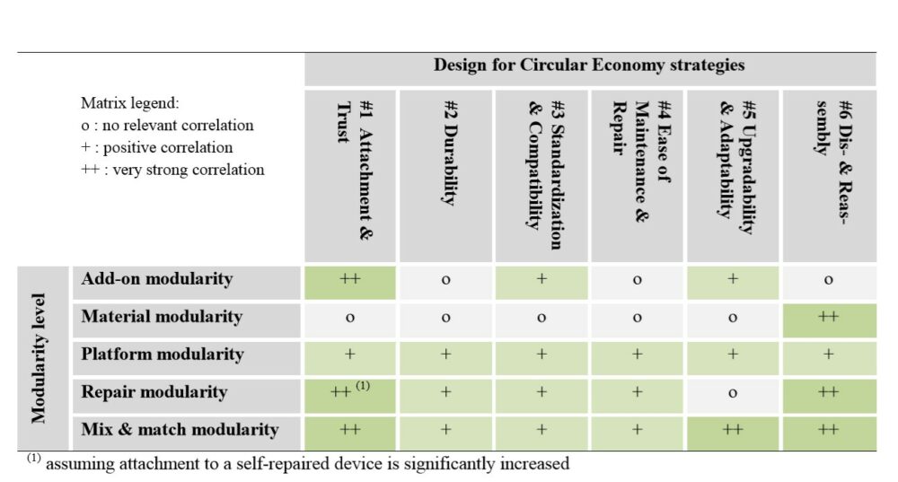 Modular design fits well into the concept of circular economy (Figure 2), even though that material modularity is not a perfect match for a circular economy. Add-on modularity has no obvious correlation with many of the strategies, but platform, repair, and mix & match modularity all correlate with (almost) all design strategies.