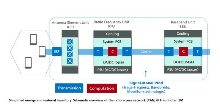 Lutz Stobbe: We developed three models: The first includes the distribution of sites and their configuration. The second model descripts the radio access network (RAN) for the individual technologies at these sites. And the third model maps the transport and core network (TCN). In our network models, we distinguished between energy consumption in actual use and material consumption related to the manufacturing of the network equipment. This approach allows for a simplified life cycle assessment for the hardware present at the sites. In other words, we examined how many circuit boards, chips, housing, etc. is required to build an antenna system or base station.